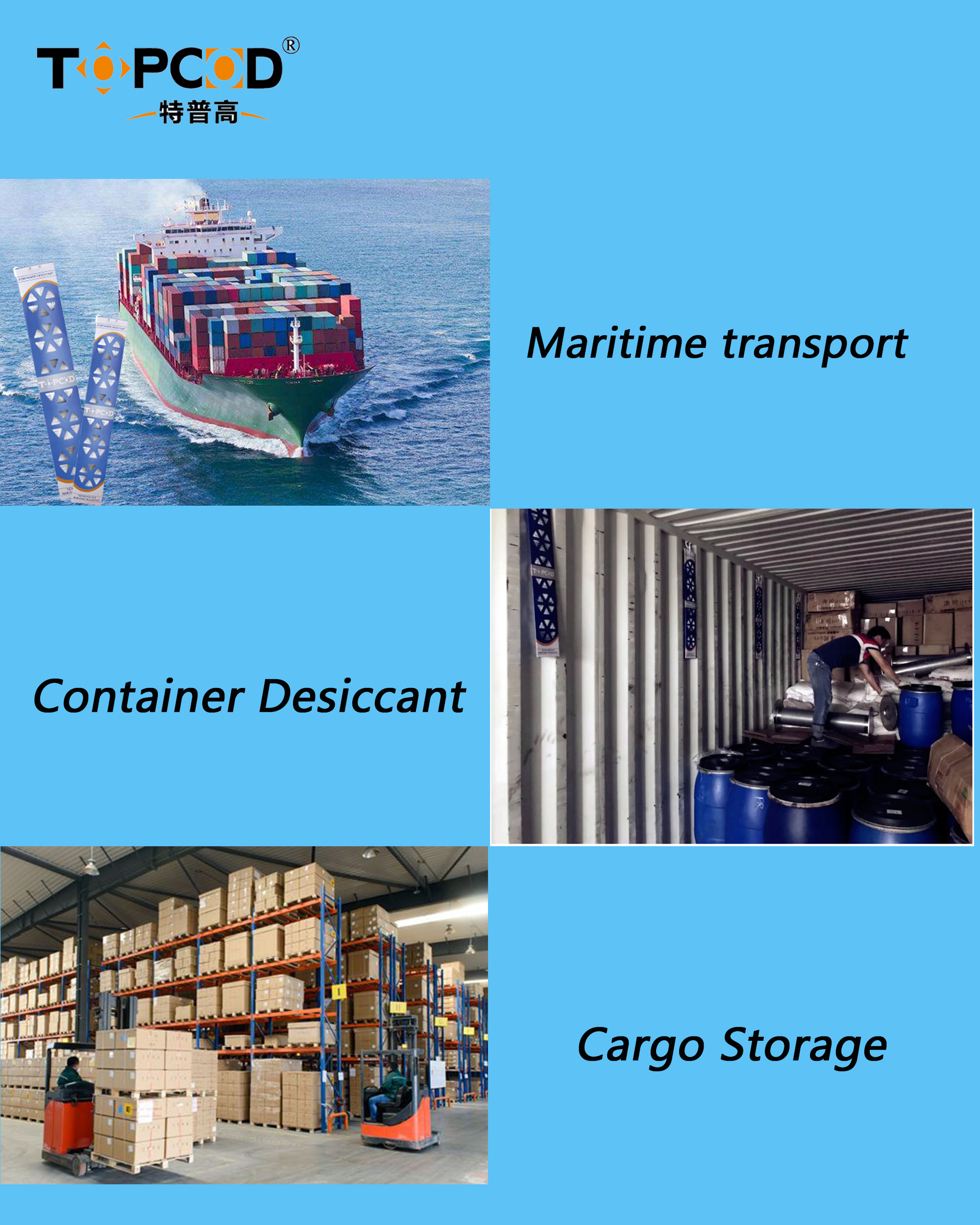 আক্রমনাত্মকভাবে পরিবেষ্টিত বায়ু থেকে আর্দ্রতা অপসারণ করে, কনটেইনার ডেসিক্যান্টগুলি শিশির বিন্দুকে কমিয়ে দেয় যাতে ট্রানজিটে পণ্যের ক্ষতি হতে 'কন্টেইনার রেইন' প্রতিরোধ করা যায়।কৃষি পণ্য, বাল্ক খাবার, গুঁড়ো, কাঠের পণ্য, কাচ, আসবাবপত্র, অটোমোবাইলের যন্ত্রাংশ, চামড়াজাত পণ্য, মটরশুটি যেমন কোকো বিন, মটরশুটি, ওয়ারপেজ, ক্ষয়, কেকিং এবং অন্যান্য ক্ষতি হতে পারে এমন পরিস্থিতি প্রতিরোধে এই ব্যবস্থা অত্যন্ত কার্যকর। এবং কফি বিন, যন্ত্রপাতি, এবং ধাতু উপাদান.শোষণ শুকনো কন্টেইনার ডেসিক্যান্টগুলি প্রস্তুতকারক, শিপার, পরিবেশক এবং অন্যান্য স্টেকহোল্ডারদের ব্র্যান্ড ইক্যুইটি রক্ষা করতে, গুণমানের জন্য তাদের খ্যাতি বজায় রাখতে এবং রাজস্ব রক্ষা করতে সহায়তা করতে পারে।